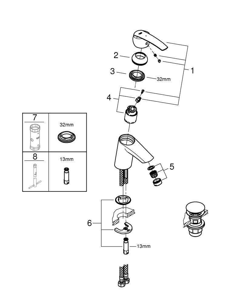 Klíčové vlastnosti jednootvorová montáž kovová rukojeť Keramická kartuše GROHE SilkMove Energy Saving 35 mm s funkcí úspory energie při studeném startu s omezovačem teploty nastavitelný omezovač průtoku povrchová úprava GROHE Long-Life GROHE Water Saving perlátor 5,7 l/min hladké tělo odpadní souprava s otevírací zátkou flexibilní připojovací hadice GROHE FastFixation rychlý instalační systém