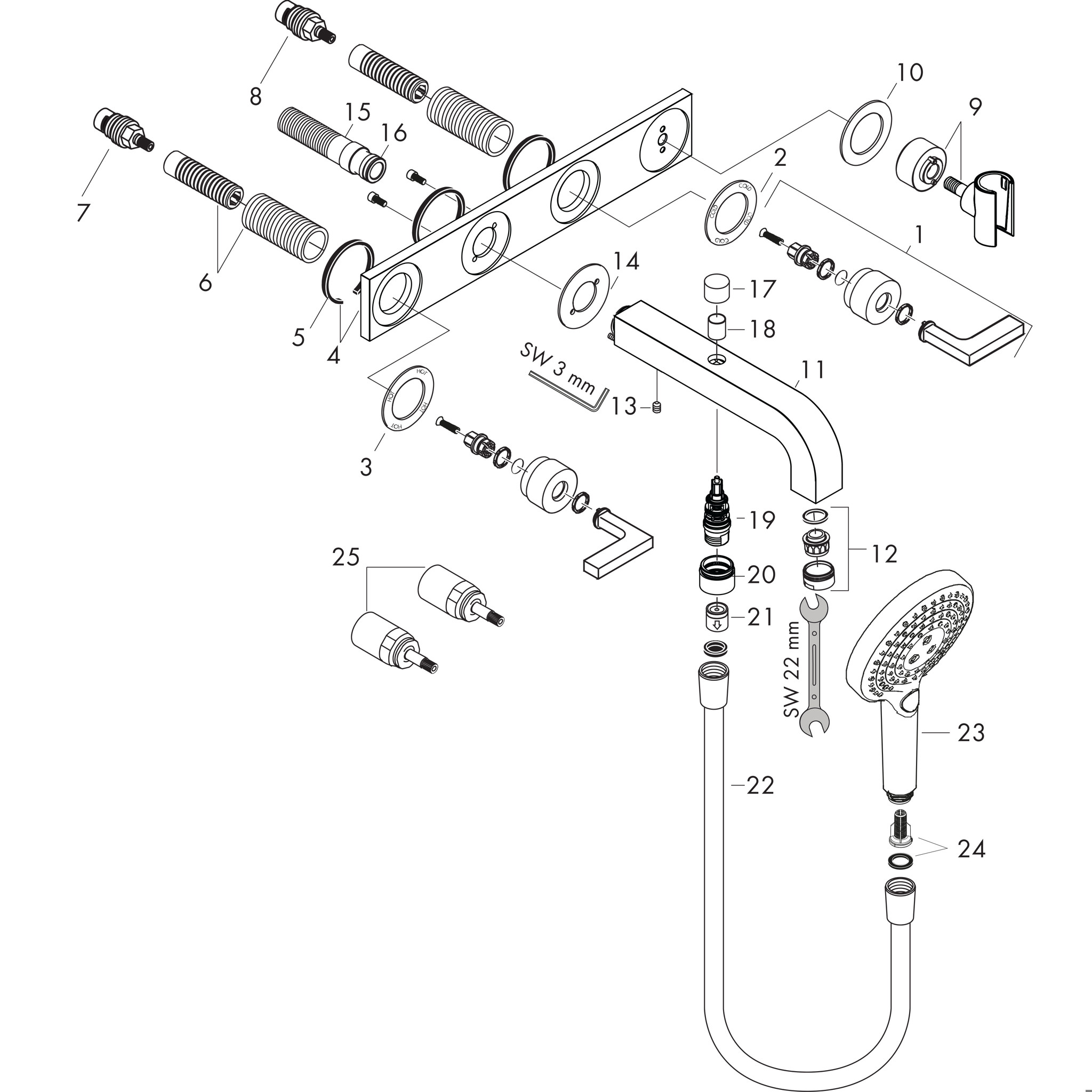 obsah balení: 3otvorová vanová baterie, ruční sprcha, držák sprchy, sprchová hadice