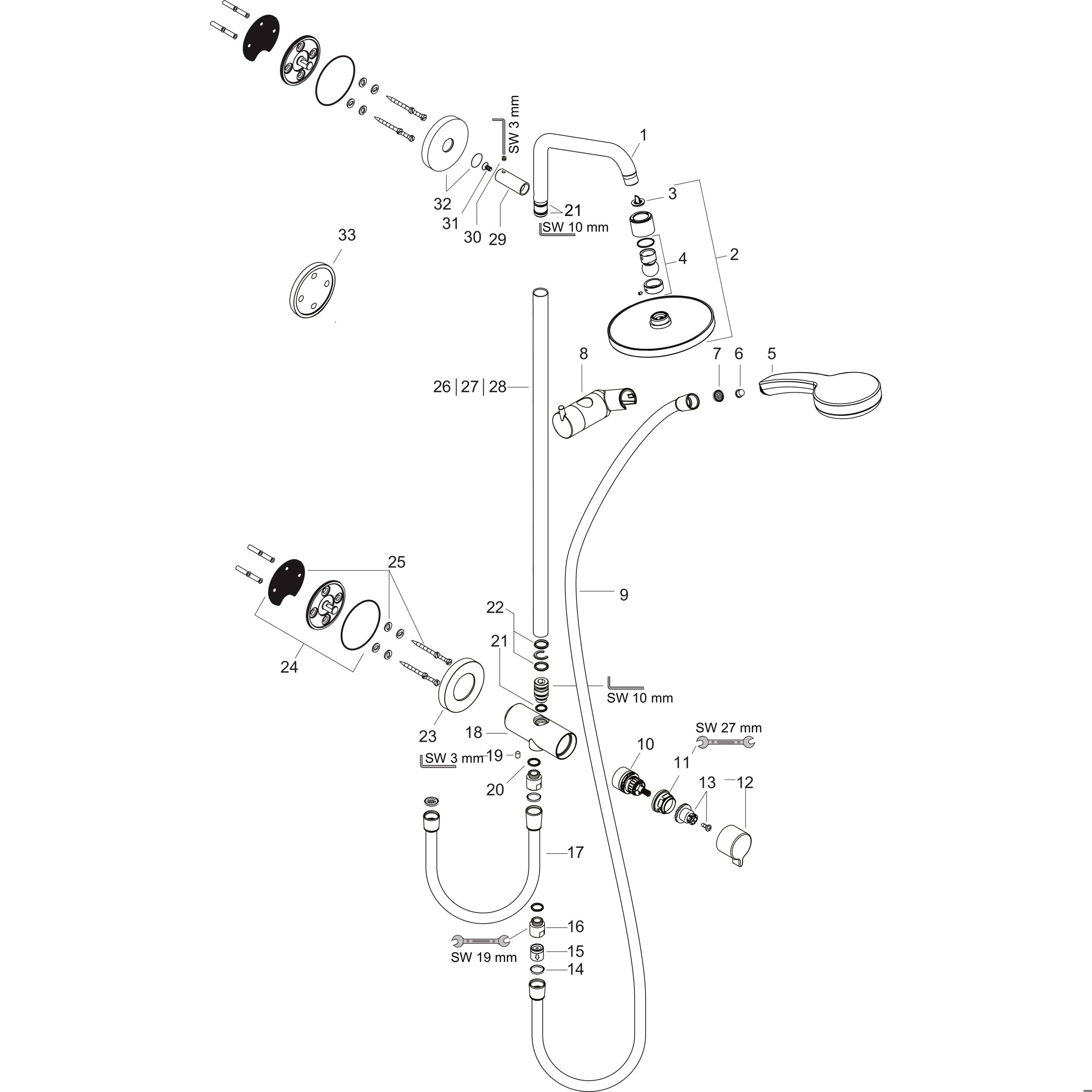 se skládá z: horní sprcha, ruční sprcha, sprchová hadice, držák ruční sprchy, připojení na stěnu. Horní sprcha Croma 160 Velikost sprchové hlavice horní sprchy: 160 mm Typ proudu horní sprchy: Rain Průtok pro ruční sprchu při 3 barech: 16 l/min Maximální průtok pro sprchovou trubku při tlaku 3 bary: 19 l/min Minimální průtokový tlak: 1,2 bar Kulový kloub: horní sprcha nastavitelná v úhlu Typ montáže: Povrchová instalace Výškově nastavitelný držák ruční sprchy Délka sprchového ramena: 270 mm Připojení vody: 2,5 mm: Sprchová hadice Isiflex 80 cm Velikost připojení: DN15 Připojovací závit: G ½ Průtok dešťového proudu při 3 barech: 16 l/min