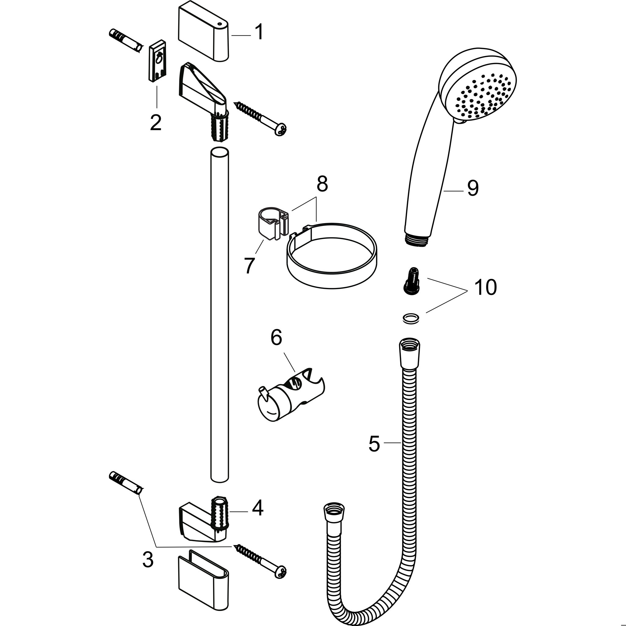 se skládá z: Ruční sprcha, sprchová tyč, sprchová hadice, držák ruční sprchy. Velikost sprchové hlavice: 85 mm Typ proudu: Normální proud, Vario proud Přepínání typu proudu pomocí otočného disku QuickClean: usazeniny vodního kamene lze jednoduše setřít prstem Úhel sklonu nastavitelný v rozsahu 90°, držák ruční sprchy otočný doleva a doprava a také nahoru a dolů Maximální průtok při 3 barech: 17 l/min Minimální průtokový tlak: 1 bar Plastové držáky na stěnu Profil sprchové tyče: kulatý Celková délka sprchové lišty: 669 mm Průměr sprchové lišty: 22 mm Vzdálenost vrtání: 625 mm