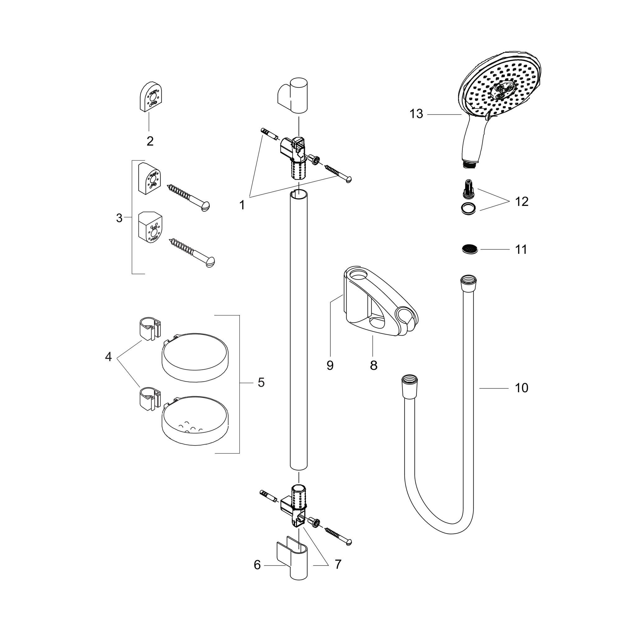 se skládá z: Ruční sprcha, sprchová tyč, sprchová hadice, držák ruční sprchy, mýdlenka. Velikost sprchové hlavice: 150 mm Typ proudu: RainAir, CaresseAir, Mix Přepínání typu proudu pomocí otočného disku QuickClean: usazeniny vodního kamene lze jednoduše setřít prstem Úhel sklonu nastavitelný v rozsahu 90°, držák ruční sprchy se otáčí doleva a doprava a také nahoru a dolů Maximální průtok při 3 barech: 16 l/min Plastové držáky na stěnu otočné na straně sprchy, aby se zabránilo nepříjemnému kroucení sprchové hadice